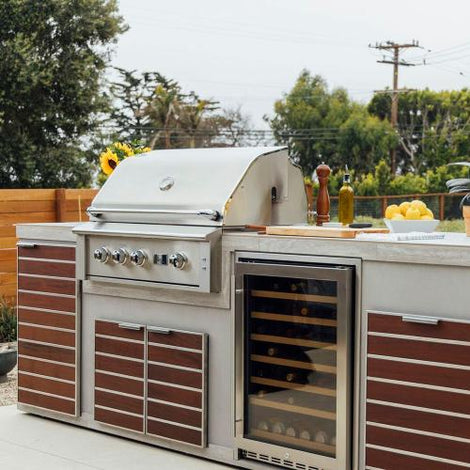 The all-new Madera Collection by Summerset Grills features outdoor kitchen storage that combines the modern elegance of high-end interior design with the rustic appeal of a natural, outdoor environment. Offering a chic new take on the traditional backyard aesthetic, the weather-resistant dry storage features high-grade North American 304-grade stainless steel and sustainably sourced teak or IPE wood options. Double-lined construction provides extra insulation and resilience against harsh environments, and weather-resistant seals keep moisture and critters out. Madera by Summerset Grills functional design extends to soft closing hinges, smooth gliding tracks, and magnetic latches, all backed by the Summerset Lifetime Warranty. The patent-pending design allows you to remove your wood slats for staining, oiling, cleaning, and further customization. The 100 perfect American Made Madera by Summerset Grills series is sure to bring any outdoor environment to life. The Madera features a half-length design, fully-opened interior to have direct access to the interior of your outdoor kitchen.